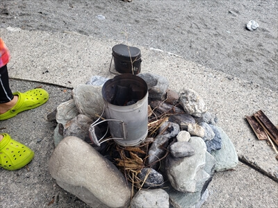 偶然、コンクリート付きの鉄筋が落ちてたんで、それを直火コンロにブチ込んで、ええ感じの飯ごうのフックに(^_^)。